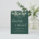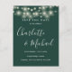 Featuring pretty string lights and signature style names, this elegant emerald green and white save-the-date card can be personalized with your special wedding day details in modern white lettering. Designed by Thisisnotme©