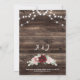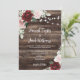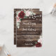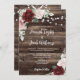 Allow your guests to feel the rustic charm of your wedding with this burgundy and blush pink floral wedding invitation. The background features a barn wood look with string lights and a bouquet of roses and eucalyptus, giving the invitation country charm. This sweet and romantic invitation is perfect for a rustic outdoor wedding and will leave your loved ones eager to join you for your special day.