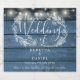 Featuring pretty string lights, this elegant wedding design can be personalized with your information in elegant lettering on a rustic blue wood panels background. Designed by Thisisnotme©
