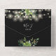 This all-in-one wedding invitation features pretty string lights and botanical greenery falling across elegant typography on a black background. The invitation includes a perforated RSVP card featuring a QR code. Designed by Thisisnotme©