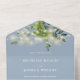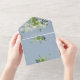 This all-in-one wedding invitation features pretty string lights and botanical greenery falling across elegant typography on a dusty blue background. The invitation includes a perforated RSVP card featuring a QR code. Designed by Thisisnotme©
