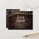 This is the modern minimal clean rustic farm dark wood String Lights design themed, in Black font, Wedding party invitation Rescheduled (postponed / postponement) postcard (Love is Patient) . It is the perfect and elegant way to make the reschedule announcement to your friends and family.