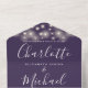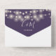 All in one wedding invitation featuring pretty string lights and elegant signature script name and monogram initials on a purple background. The invitation includes a perforated RSVP card with your wedding website QR code and details. Designed by Thisisnotme©