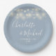 Elegant dusty blue wedding paper plates featuring pretty string lights, signature style names and your special wedding date. Designed by Thisisnotme©