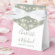Elegant sage green wedding favour box featuring pretty string lights, stylish signature script names and special date set in chic typography. You can personalize with your own thank you message under the lid. A perfect way to say thank you to your guests! Designed by Thisisnotme©