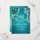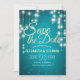 Save The Date Wedding Invitation Card Templates - Elegant Faux Gold Foil Save The Date Lettering Script and Vintage String Lights with Turquoise Blue Glitter Sparkle Background.