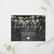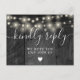 A string lights rustic black wood barn boho RSVP card with chic typography. The reverse features your details and a fun guest song request. Designed by Thisisnotme©