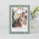 Wish friends family Happy Holidays with a personalized vintage Christmas photo Christmas card showcasing your family on the front over a watercolor green striped pattern topped with a red and green Christmas bow, and a back side with 3 family pictures and an editable note.