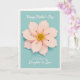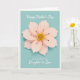 This card features a calm, muted aqua-blue background with a large stylized flower centered like a gentle gift ❤️. The bloom is made of many soft pink petals layered in smooth curves, with shading that shifts from deeper blush near the base to pale, airy tips. Fine outlines and faint shadows give the petals a lifted look, as if they’re leaning closer in a tender, affectionate gesture. In the middle, a textured cluster of tiny yellow-orange dots forms the flower’s core, with a few slender dark filaments reaching outward for contrast. Near the top, a short line of white text sits lightly above the illustration, like a quiet whisper of celebration. Below the flower, a second line of white text is placed neatly, offering a warm note of appreciation without crowding the design 🌼. A slim white border frames the entire scene, with the soft pink petals standing out against the cool aqua field.