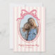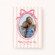 A charming Valentine’s Day photo card featuring soft pink stripes and a bold, bright pink bow framing your favorite picture. The whimsical scalloped oval frame adds a sweet, playful touch, making it perfect for family photos, kids’ portraits, or a cute snapshot of you and your loved one. A fun and feminine design that’s easy to personalize for a heartfelt holiday greeting.