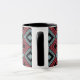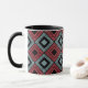 This mug has an art deco design of diamond shapes with diagonal lines, black diamonds, and coloured diamonds in shades of blue and cranberry.