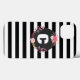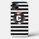 Apple iPhone 8/7 case that has a black and white stripe pattern with a floral monogram design in the centre. You can personalize this case by adding your name or initial using the customized template.