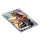Watercolor splash art of a grey tabby cat playing guitar in a purplish red vest and denim shorts.