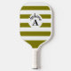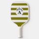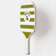 This sporty paddle features bold horizontal stripes in Olive and white, creating a dynamic rhythm that suggests speed, clarity, and playfulness. At its centre, a round white emblem anchors the design, overlaid with elegant cursive text and a monogram-style element. The handle boasts a textured white grip for comfort and control, while the overall layout combines personal flair with clean aesthetics. Ideal for game lovers who value expression both on and off the court.