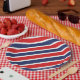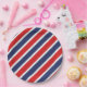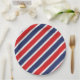 Party paper plate is shown in a patriotic red, white and blue stripes print.