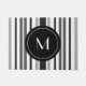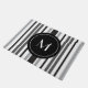 A stylish design of stripes in various shades of grey, black and white with a black circle. The initial monogram letter in the circle can be customized.