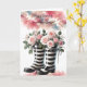 A beautiful birthday card featuring a whimsical pair of black and white striped boots filled with soft pink roses, swooshes of ombre colour accent the background. Customize as desired.