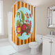 A cute shower curtain for kids who love zoo animals, safari animals, jungle animals, features a background of orange, white, and brown stripes with a blue circular with jungle plants, a giraffe, lion, and elephant!
