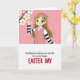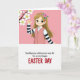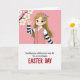 This card features a friendly illustrated person with large dark eyes and a bright smile, their golden-brown hair flowing under a pink headband topped with a fuchsia flower 🌷. They wear a white collared shirt layered with a rose-toned knit vest and a black-and-white striped long-sleeve, giving a cozy, put-together look. A slightly raised left hand reads like a gentle hello, as if they’re greeting someone they care about with an easy, affectionate warmth. The background is a soft blush pink that keeps the focus on the figure while adding a springtime glow. From the upper left corner, a slender branch curves inward with small white five-petaled blossoms and sunny yellow centres, framing the scene like a quiet bouquet. Along the bottom, a white rectangular panel holds the message in dark lettering, “Sending you wishes your way for a very happy,” leading the eye toward the holiday greeting. The final line, “EASTER DAY,” is set in red and stands out strongly on the white panel, with a little 🐰 feeling implied by the seasonal palette and flowers.