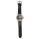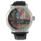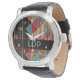 A watch with my original design of stripes over multicolored triangles and sample initials for you to customize with your own.