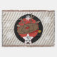Beautiful Christmas holiday throw blanket features a cute red nosed reindeer on a background of grey with white diagonal stripes, a strip of solid black with a few white snowflakes, and a red centre with white polka dots.