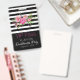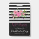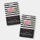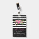 Stylish bachelorette party accessory badge done in a black and white striped pattern, across the top with pretty pink flowers. The bottom half of the badge is done in solid black. Pink and white custom text is ready to personalize for your event. Great for birthday parties, bachelorette parties, Sweet 16 and more.