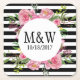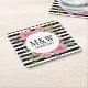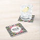 Elegant pulp board paper wedding coasters done in a black and white striped pattern, with pretty watercolor pink peonies. A white round text area, in the middle of the coaster, has custom black text. Personalize the bride and groom's monograms and wedding date, for your wedding or special occasion.