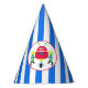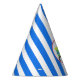 Boy's birthday party hat done in a blue and white striped pattern, with cartoon graphics of a colourful robot set in a white circle, on the front. Matching robot invitation and party supplies are available.