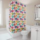 This shower curtain has a mid-century modern design of striped semicircles and solid semicircles put together on a field of white.