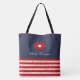 Graphic design of red lips with a heart, on an elegant striped tote with red and white stripes, personalized with your own name