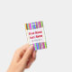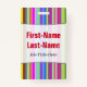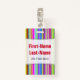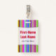 This badge design features an eyecatching pattern of stripes (or lines) of various colours. It also features a customizable name in red coloured text within a light coloured area. There is also a customizable message under the name that could show information such as a job title, or a profession, or a business/company name. [~Z0000176]