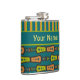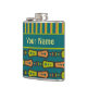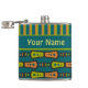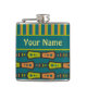 A stylish Hip Flask to personalise, with a jazzy tribal pattern in Orange-Red, Yellow-Green and Black on a Teal Background, teamed with a matching striped pattern. Part of the Posh & Painterly "Jungle Drums" collection.
