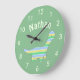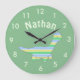 Green and blue stripy cartoon dinosaur on cute Kid's personalized wall clock.