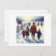 A family dressed for winter is walking towards a sign that welcomes them to Canada, with snow-covered ground and a fenced path. Other figures are seen in the distance, creating a sense of journey and exploration in a frosty landscape.