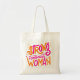 A cream-colored tote bag with a white background features a graphic design with bold, colorful lettering. The text reads "STRONG FEMINIST WOMAN" in a playful, hand-drawn style. The word "STRONG" is in a vibrant orange with a pink outline, and the letters are thick and rounded. Below it, "Feminist" is written in a smaller, cursive pink font. The word "WOMAN" is in a bright pink, with thick, blocky letters. The entire design is framed by a thin, light orange border with small radiating lines. The tote bag has two white straps and appears to be made of canvas. The lighting is bright and even, highlighting the details of the graphic.