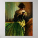 Study in Black and Green by John White Alexander (Pennsylvania 1856–1915). The idealized, impassive woman, shown as if she were a precious object was a painter favourite subject, Here, a young beauty is absorbed to pinning a bauble or blossom to the low neckline of her elegant evening gown. The skirt’s sinuous striped pattern, the curves at the knees and shoulders, and the contour of the upswept hair justify the description of Alexander as “the painter of the flowing line.” His dazzling brushwork is especially notable in the rendering of the rich fabrics and in the otherwise plain background.