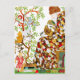 Capture the wonder and spirit of Christmas time! Colourful postcard depicting a man wearing a patchwork quilt robe, and he is stuffing a toy horse in a Christmas stocking. He is surrounded by lots of other toys hanging in a tree, like a train set, a doll, an elephant, and a teddy bear.