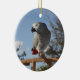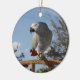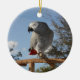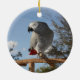 Pretty African Grey on a tree stand with her pretty grey feathers and red tail watching her surroundings outdoors against the blue sky and oak trees.