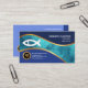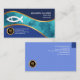 An exquisite simple modern professional design. Design features three shades of sea water accentuated by the faux gold waves. The top portion, an elegant dark blue, plays host to the name, job title and contact number. The coral sea blue portion below has an abstract white fish near the left wall. Directly underneath, in a lighter blue shade, you have your own faux gold icon logo of three fishes. Beside this is your business name and contact details.