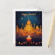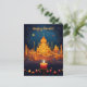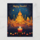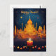 Stunning Diwali postcard with night view of a temple and custom text in middle in shades of yellow and orange on dark background