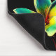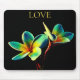Stunning watercolor-themed digital art design of two plumeria flowers. The background is a solid black, and the flowers have shades of blue and yellow. The stylish yellow text says, "LOVE". You can easily customize and change the wording if you wish. This eye-catching design on a mousepad is sure to attract some attention in your home or corporate office.