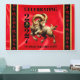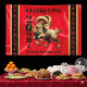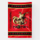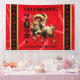 Elevate your 2027 lunar new year entertainment experience with this celebratory vinyl banner, which features the Fire Goat dancing on a luxurious faux red silk background bordered by traditional Chinese new year greetings on black and faux gold foil, plus the Chinese letterform for the Goat/Sheep/Ram in faux gold foil, standing in place of the zero in the year.
