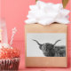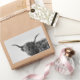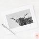 Rectangular photo sticker with a sturdy but funny Scottish Higland cow with big horns, long hairs in front of the eyes and the mouth half open in black and white / monochrome.