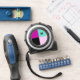 A stylish tape measure with an abstract colour block design. The design is divided into four sections, magenta, black, turquoise and pink. Personalize with the recipient's initial, which will form a modern monogram on the top right of the design. A useful and colourful gift for trade, crafting, DIY and more.