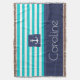 Nautical throw blanket with turquoise & navy blue striped pattern and customizable text.