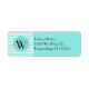 Stylish return address labels done in pretty aquamarine, with black custom text. A aquamarine and white chevron zigzag pattern decorates the left side of the label, with a aquamarine round disc and a black one letter monogram. Personalize all the text on this chic address label, great for personal or business use.
