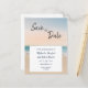 A modern look with a beach as the background. You will personalize this save the date card with the bride and groom's names, date of wedding and location.