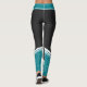These black modern workout leggings feature an elegant and delicate white floral design on a blue teal background on the ankles and calves and a teal stripe on the waistband.