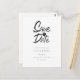 This minimalist black and white save the date card features a stylish etched save the date above your details set in elegant text.