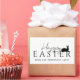 A modern minimalist Happy Easter design by Destei in chic black and white. The word “Happy” appears in delicate script, partly overlapping the “Easter” lettering for a stylish touch. A resting bunny silhouette perches over the letters E and R, adding a subtle festive accent. Below, a personalizable text area lets you add your family name and year. Sleek, modern and perfect for Easter gifts, cards or decorations.